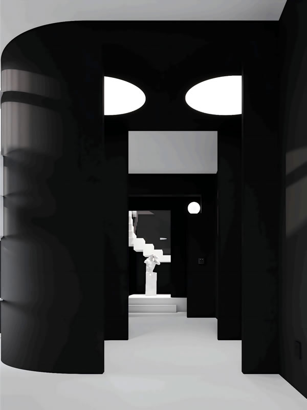 The design concept for this project was inspired by four natural elements—waves, mountains, stones, and sunset. White wave-like forms are applied to the ceiling and floor, creating a sense of flow and lightness, while black mountain tones define the walls and emphasize verticality. To avoid a monotonous atmosphere, circular and square light fixtures are embedded in key positions, introducing rhythm and layered illumination.