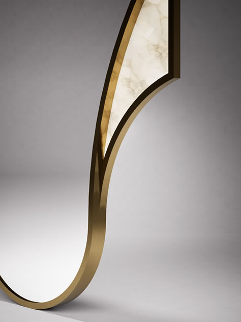 Inspired by the structure of the female body and the way fashioninteracts with it, the overall form of this mirror was conceivedas a dialogue between body and garment. Integrated lighting isincorporated to meet everyday functional needs whileenhancing the sculptural expression of the piece.