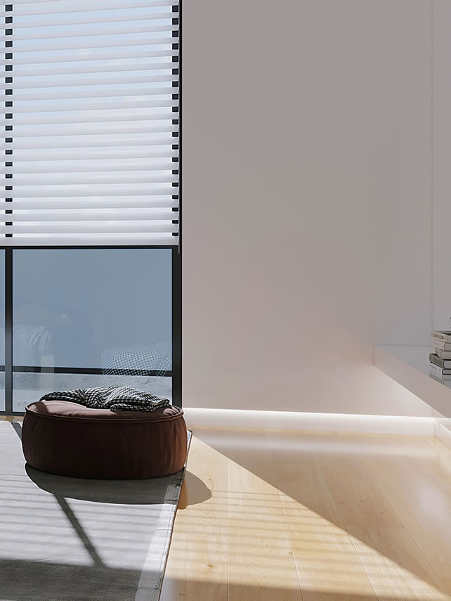 Daylight is filtered through venetian blinds, slicing natural light into fragments that cast dramatic reflections indoors. Playful animal- and human-shaped fixtures add character, while the contrast between white walls and rough red brick introduces a sense of tension—calm in atmosphere, yet charged with energy.