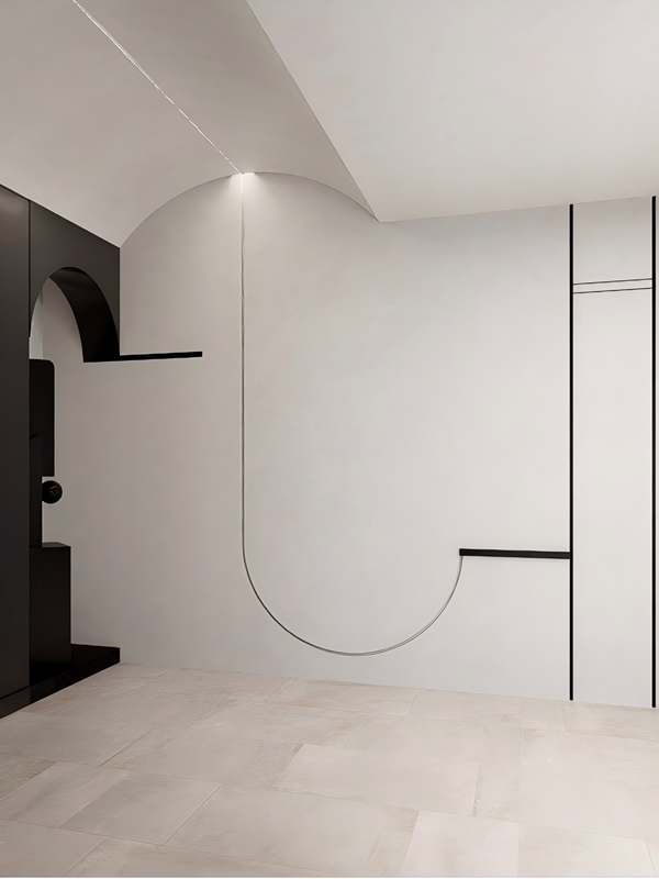 Along the circulation path, successive curved elements—double arcades, Roman-framed arches, and semi-circular niches—soften the architecture and introduce spatial fluidity. In the main hall, preserved gray concrete walls and columns ground the space and sharpen the contrast with the white interior surfaces.
